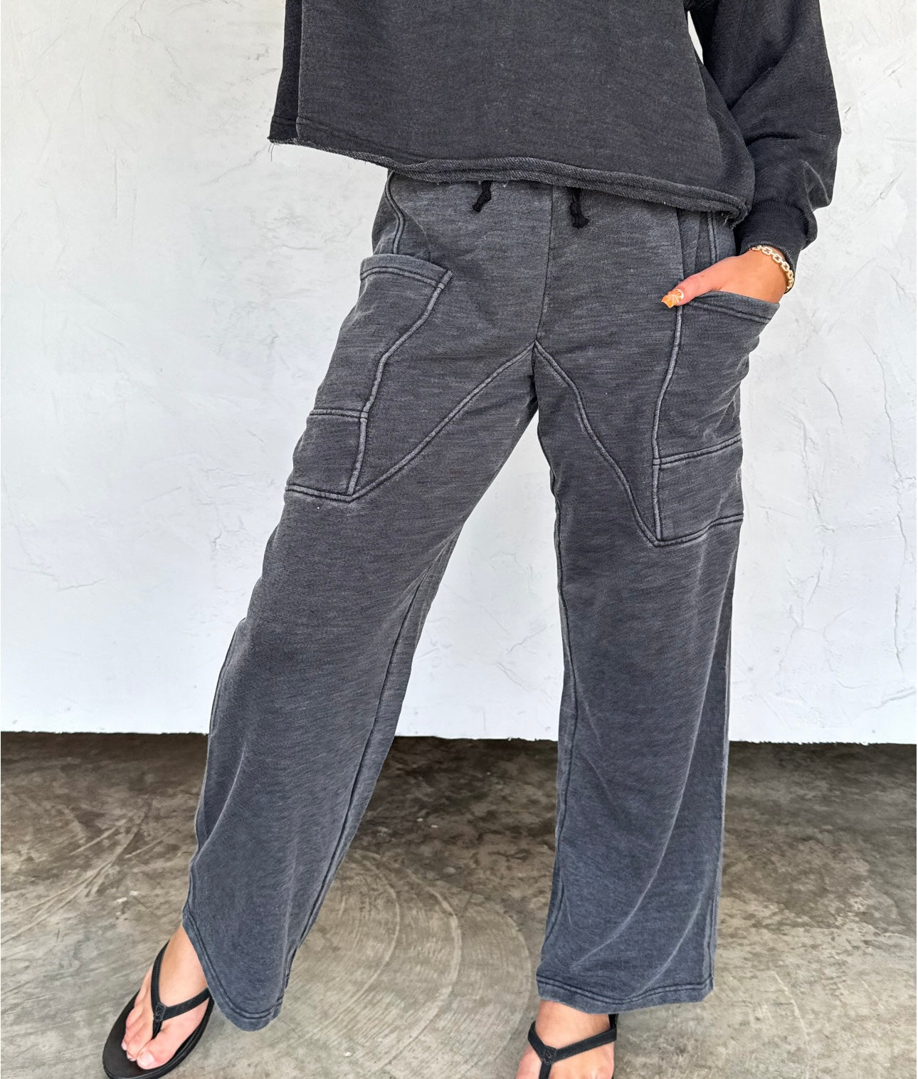 These wide leg pants feature a slight high-rise fit with an adjustable drawstring waistband for all-day comfort. Designed with bold front patch pockets and exposed seam detailing, they offer a casual yet elevated look. The washed terry cotton fabric adds a vintage vibe, while the relaxed wide leg cut keeps them effortlessly cool and easy to style.