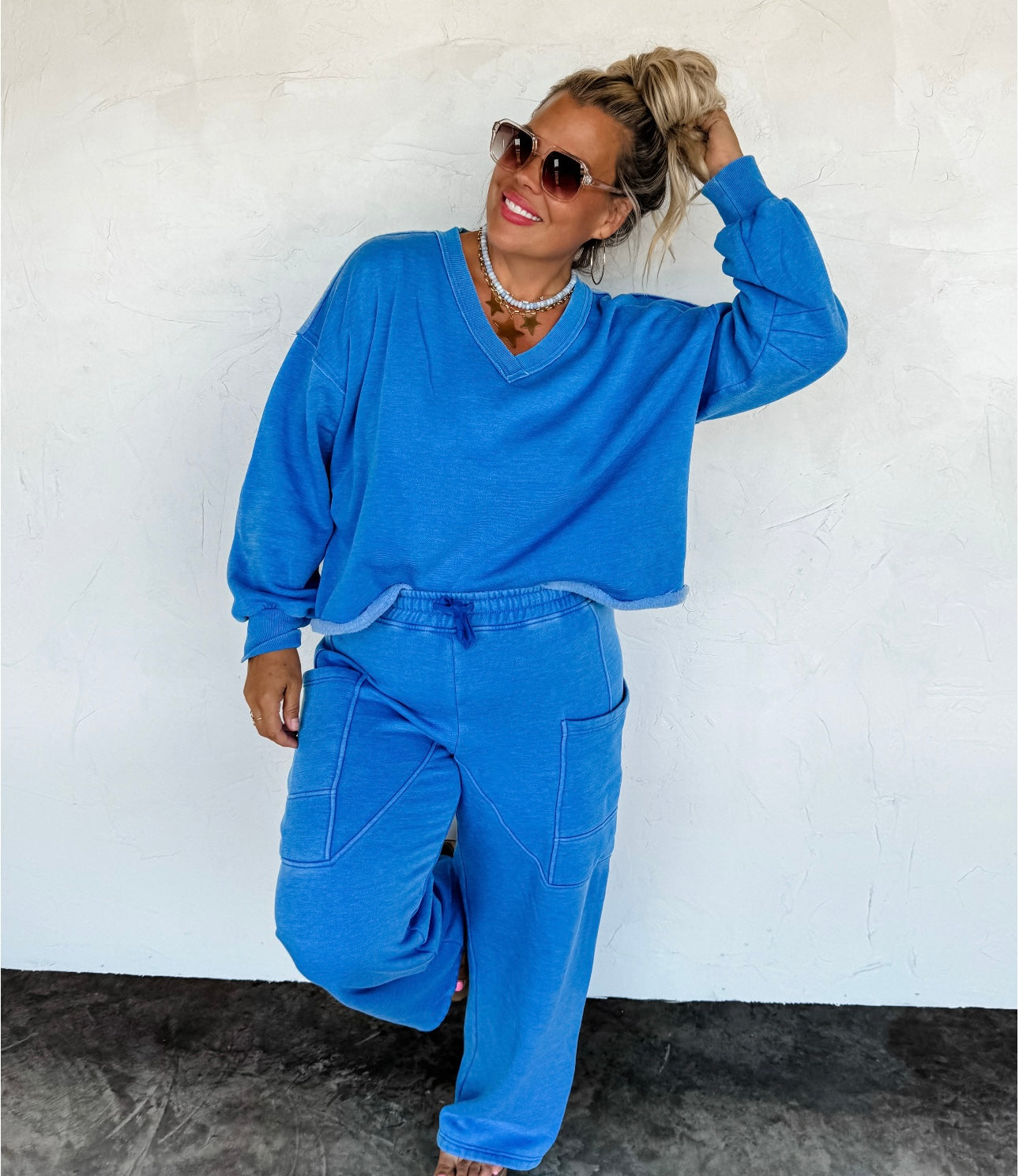 This pullover features a relaxed fit with dropped shoulders and a wide V neckline for a laid-back, easygoing look. Made from soft washed sweatshirt/terry fabric, it has visible seam details and a slightly oversized silhouette for added comfort and style. The hemline hits just below the waist, making it perfect for tucking or wearing loose.