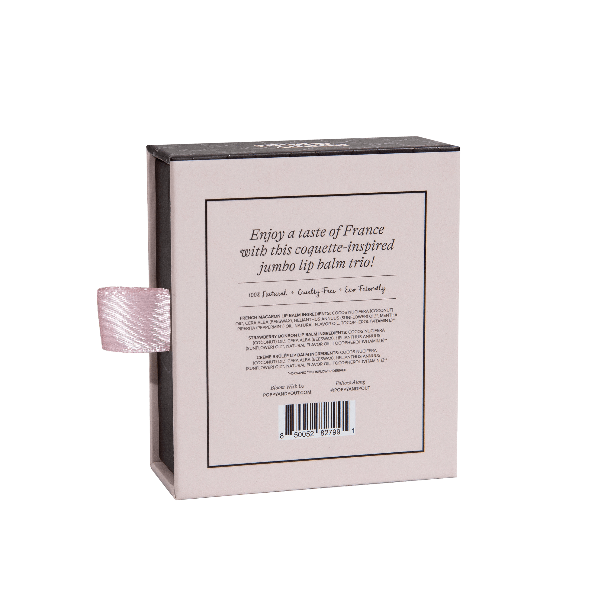 The Coquette Lip Balm Gift Set features 3 French-inspired lip balms all tied up with a bow. This pink gift set of lip balms makes for the perfect stocking stuffer this holiday season! Indulge in three decadent lip balms: French Macaron, Strawberry Bonbon, and Crème Brûlée. As always, all of our lip balms are made with 100% natural ingredients and are packaged in eco-friendly materials. These gift sets are for girlhood and anyone who loves French or Parisian inspired products. The perfect addition for Valentine gifts, too! Be sure to browse our lip scrub and lip mask offerings, as well!