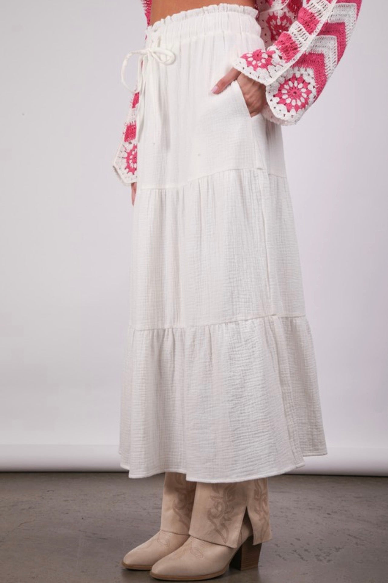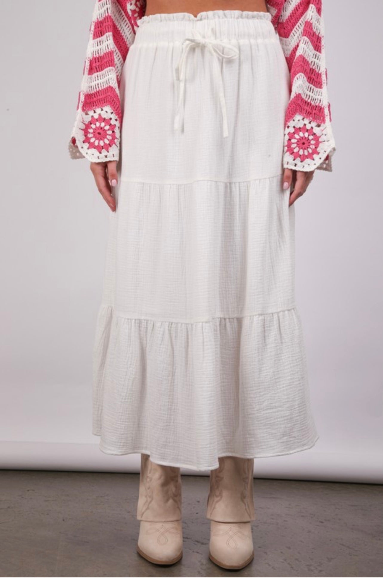 This flowy tiered maxi skirt is the perfect blend of comfort and effortless style. Designed with a flattering elastic waistband and soft, lightweight fabric, it moves beautifully with every step. The tiered silhouette adds volume without bulk, making it easy to dress up with a blouse or keep casual with a graphic tee or tank.