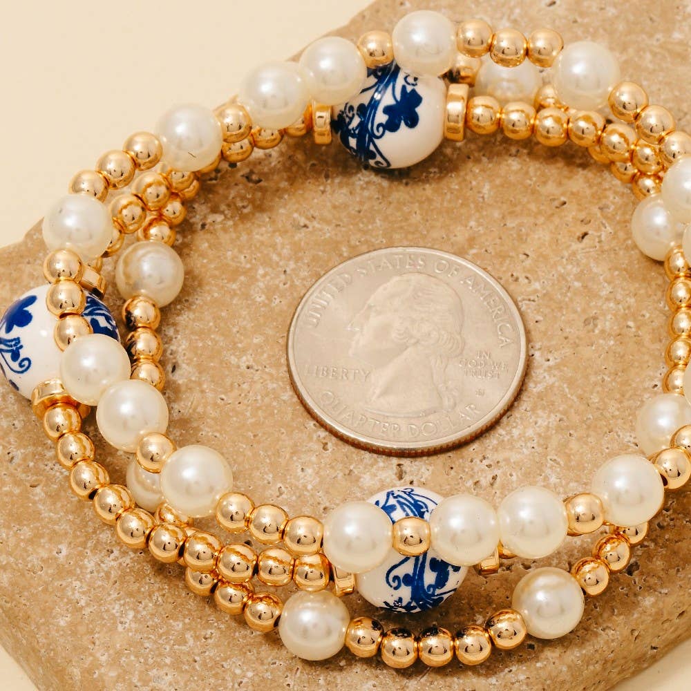 Floral Ceramic And Pearl Beaded Bracelet Set