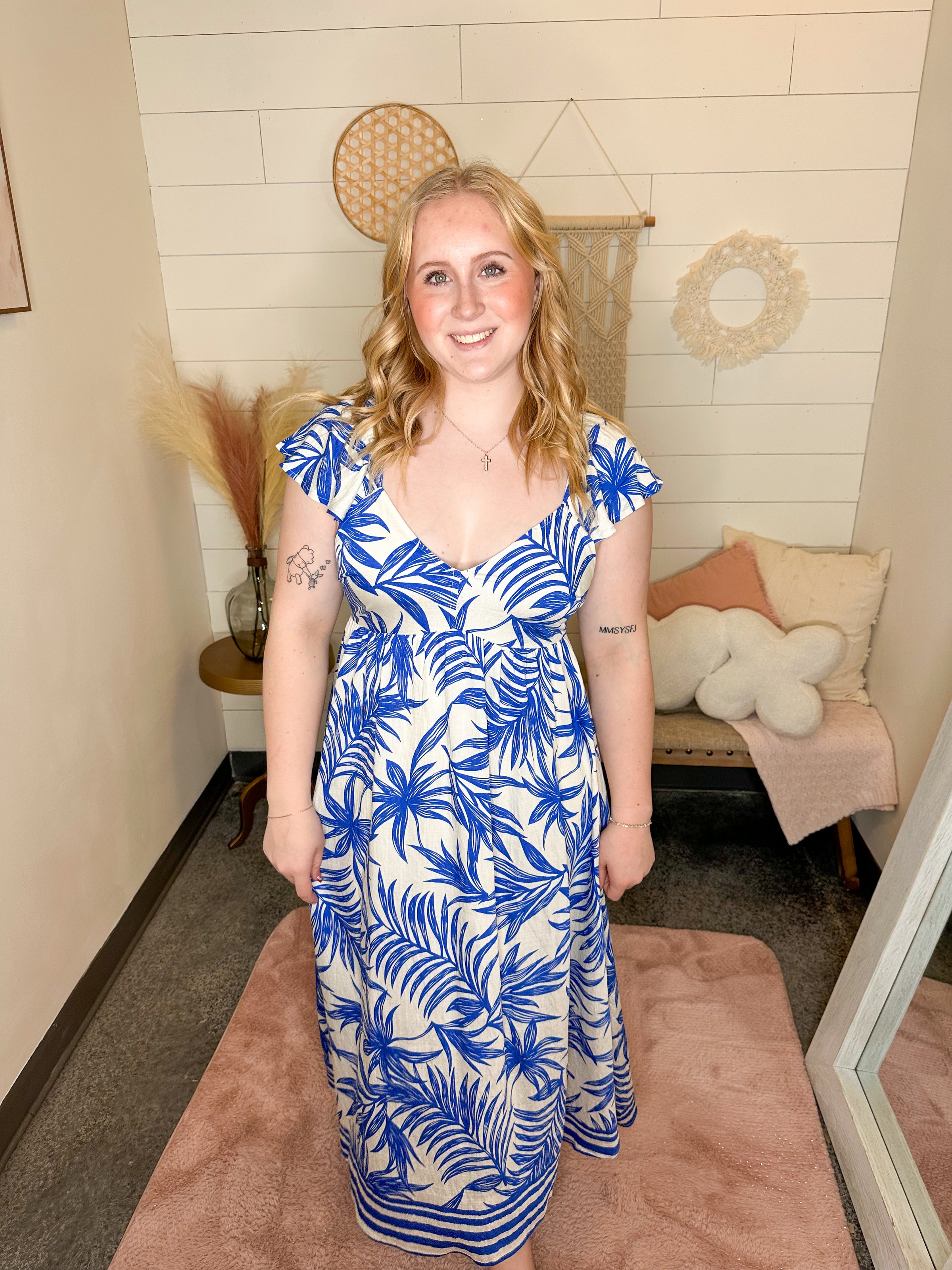 This stunning blue and white palm print midi dress is made for sunny days and effortless style. Featuring a flattering V-neckline, flutter sleeves, and a flowy, easy silhouette, it drapes beautifully for all-day comfort. The bold tropical print and border detail add the perfect touch of resort-inspired charm—dress it up with wedges or keep it casual with sandals or boots.