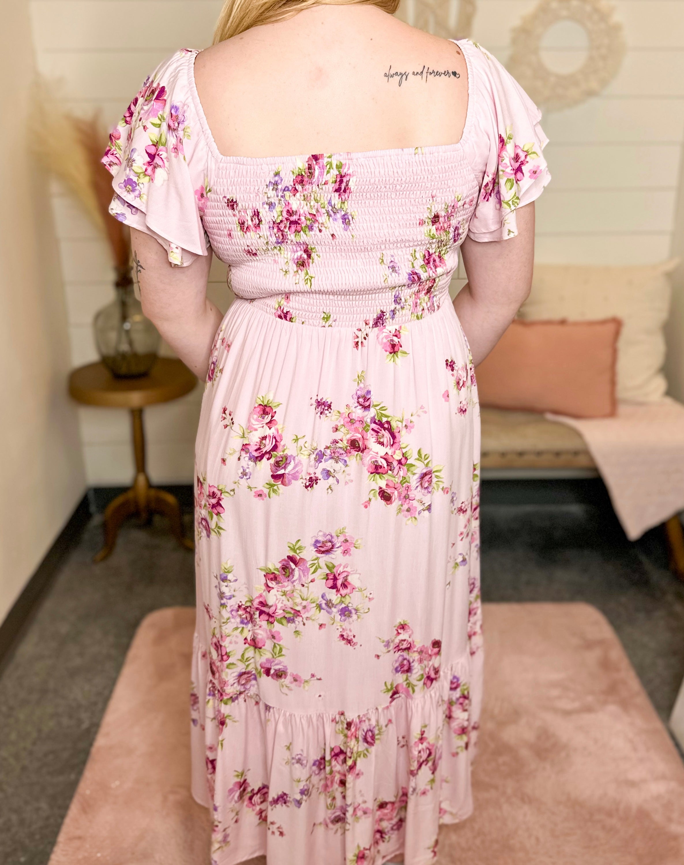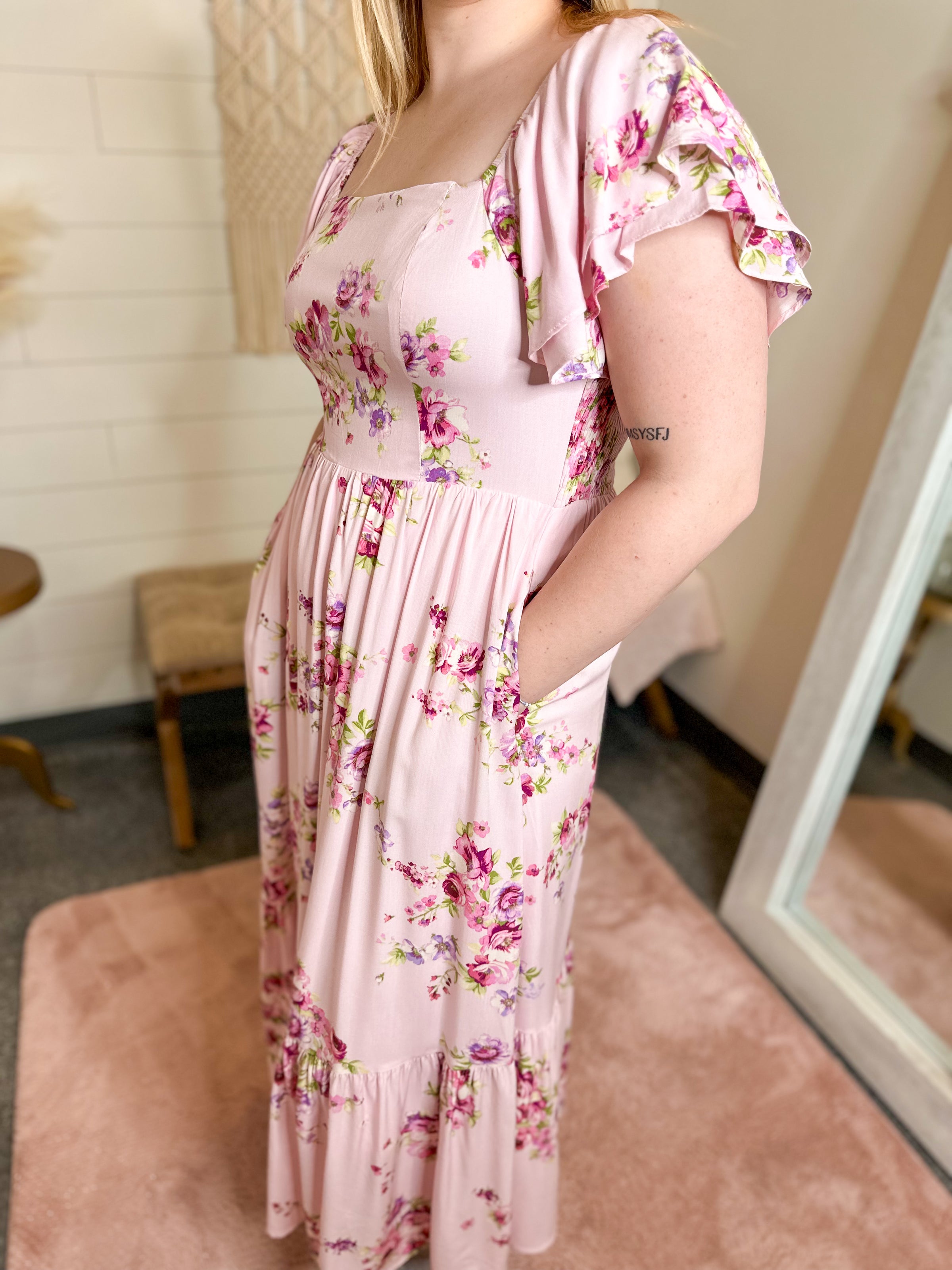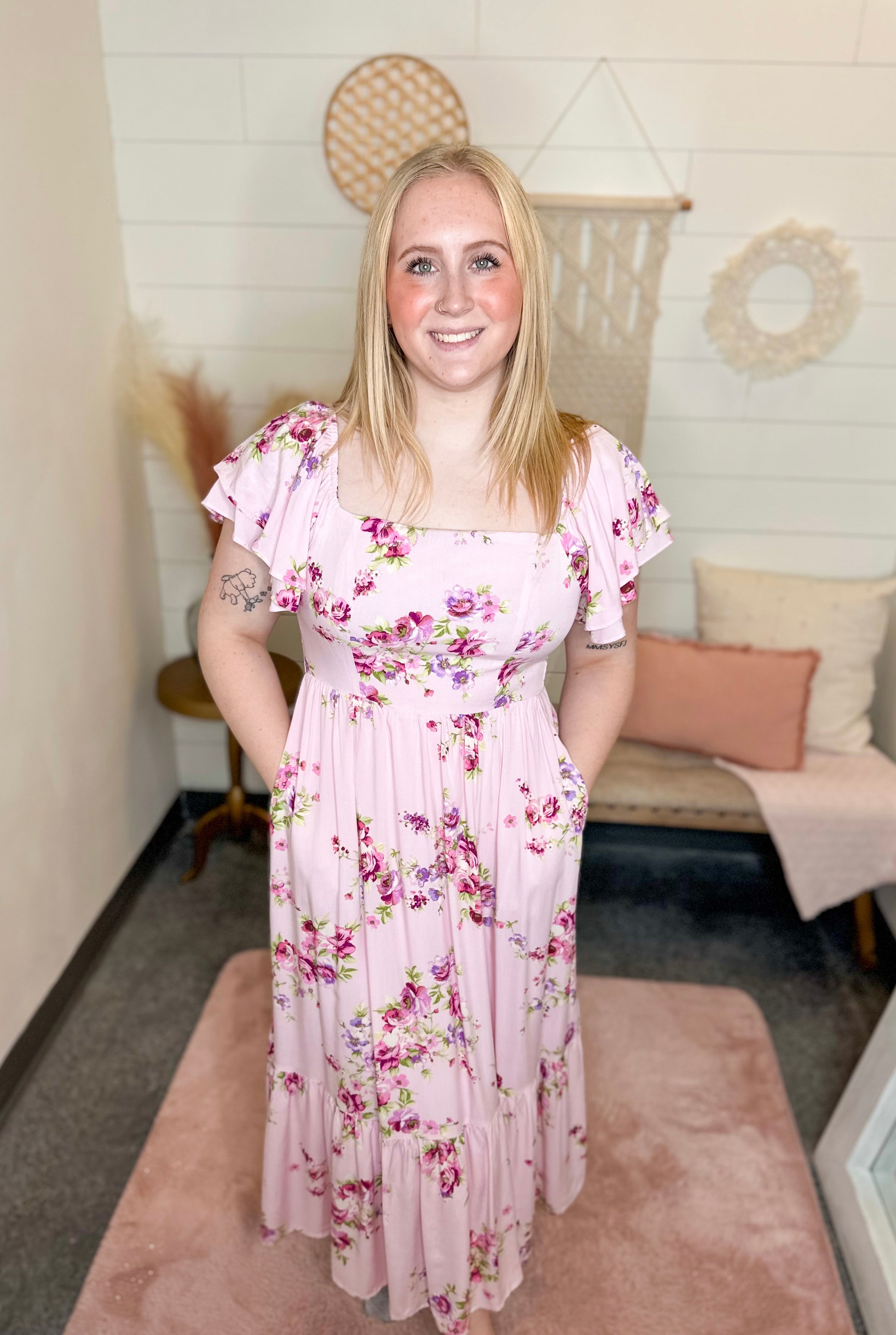 A dreamy floral maxi dress with romantic ruffle details and a breezy silhouette, perfect for warm-weather outings and special occasions. It is fully lined & has pockets.