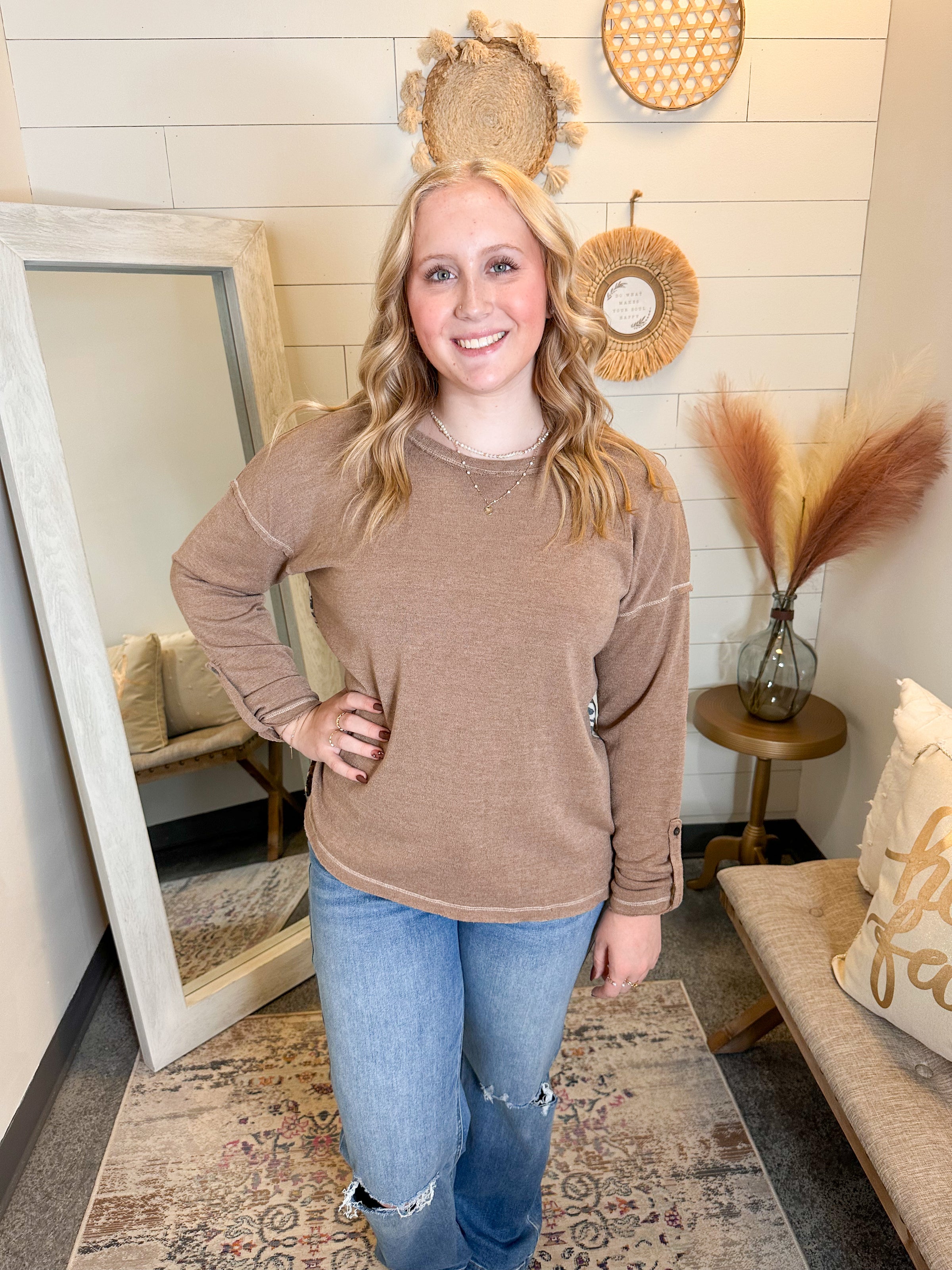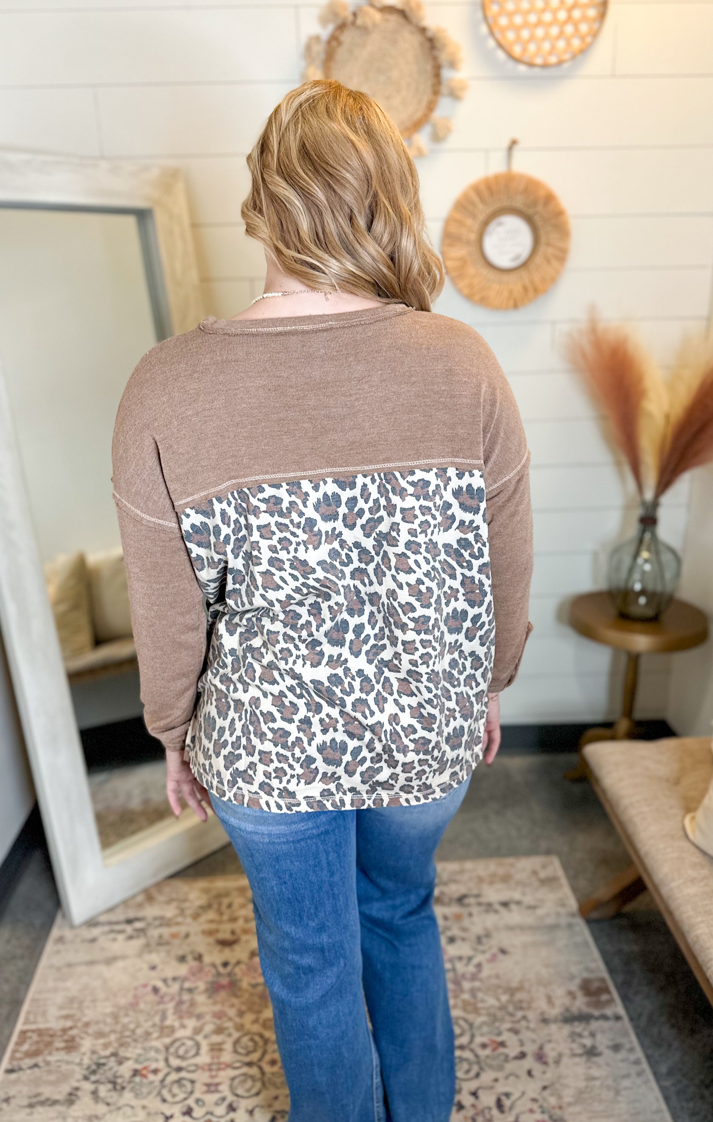 Our long sleeve knit top has an animal print contrast detail on the back.