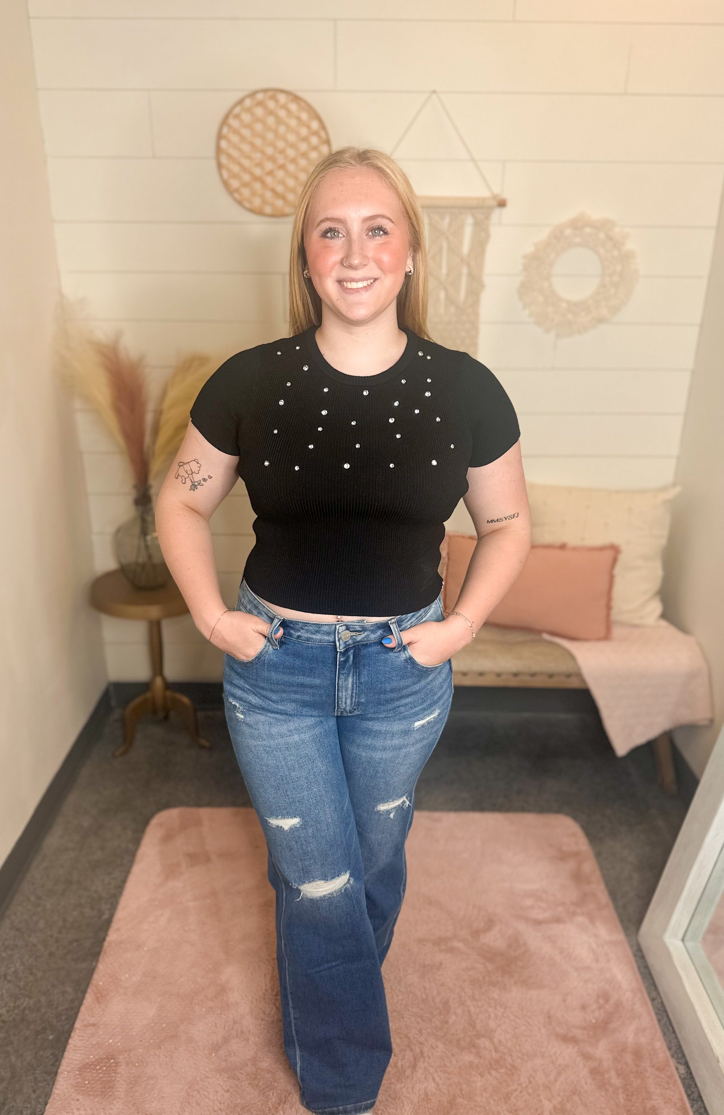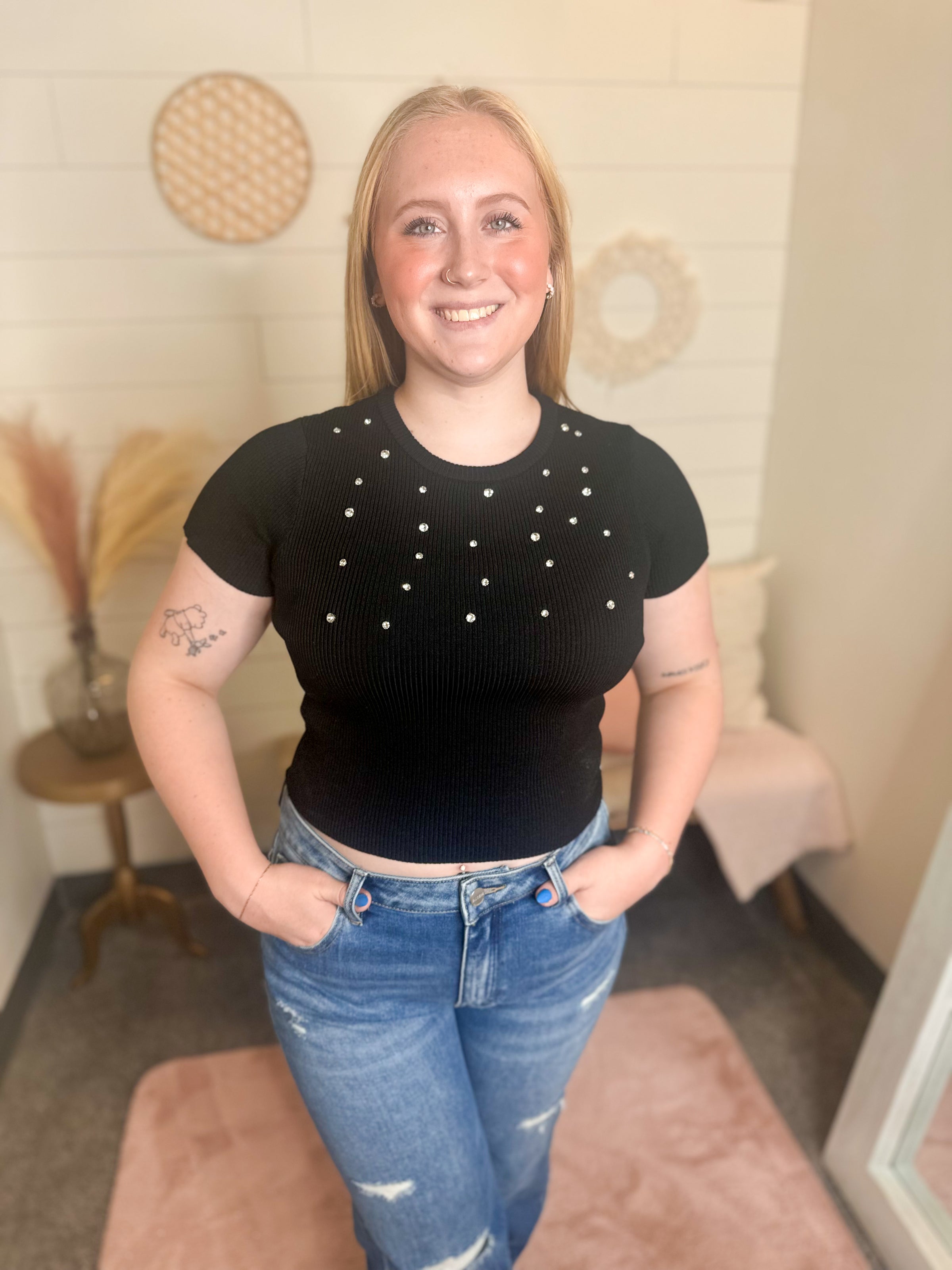 This short sleeve, sweater fabric top had a gorgeous rhinestone detail on it.