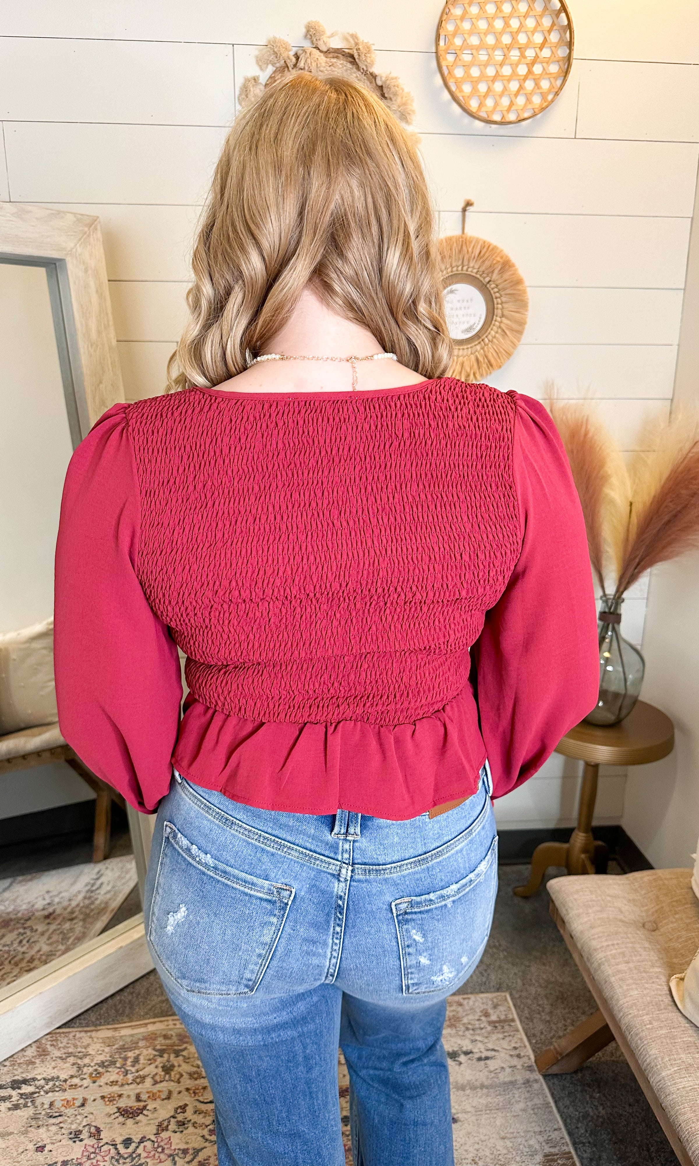 This long sleeve top has a ruched front with smocking on the back. Great top for date night!