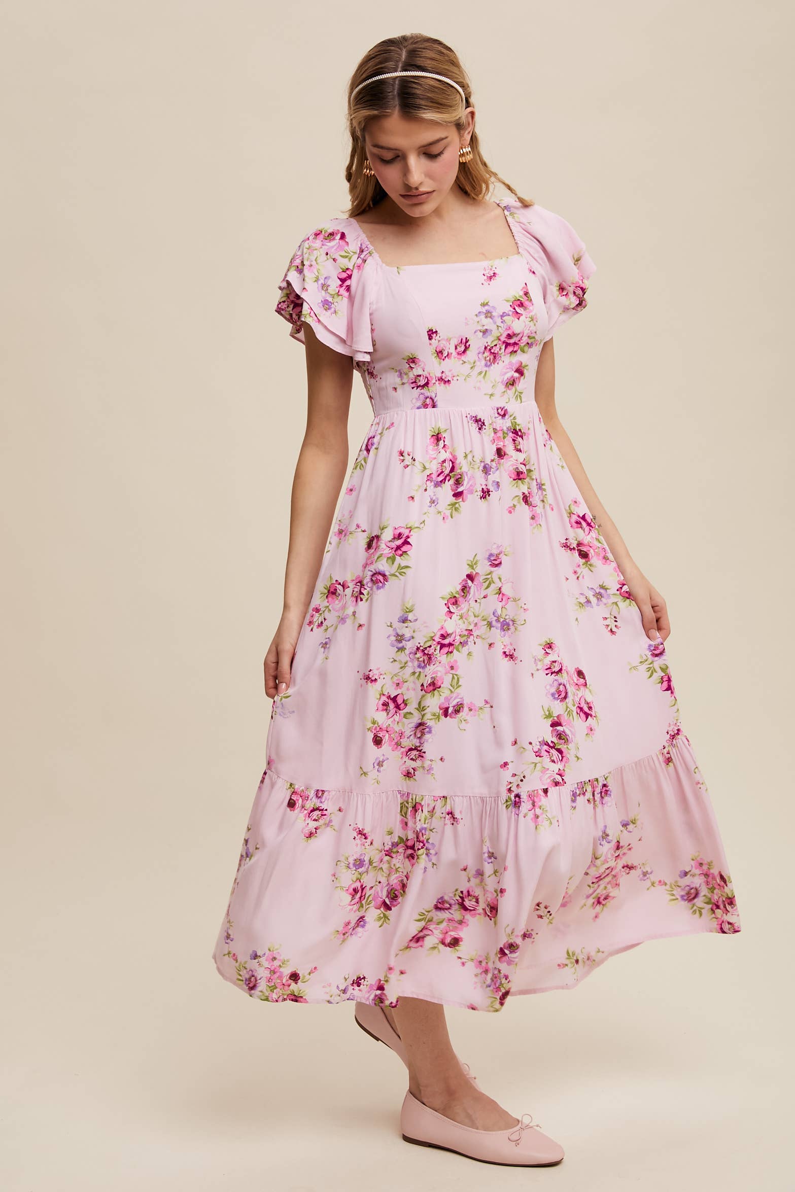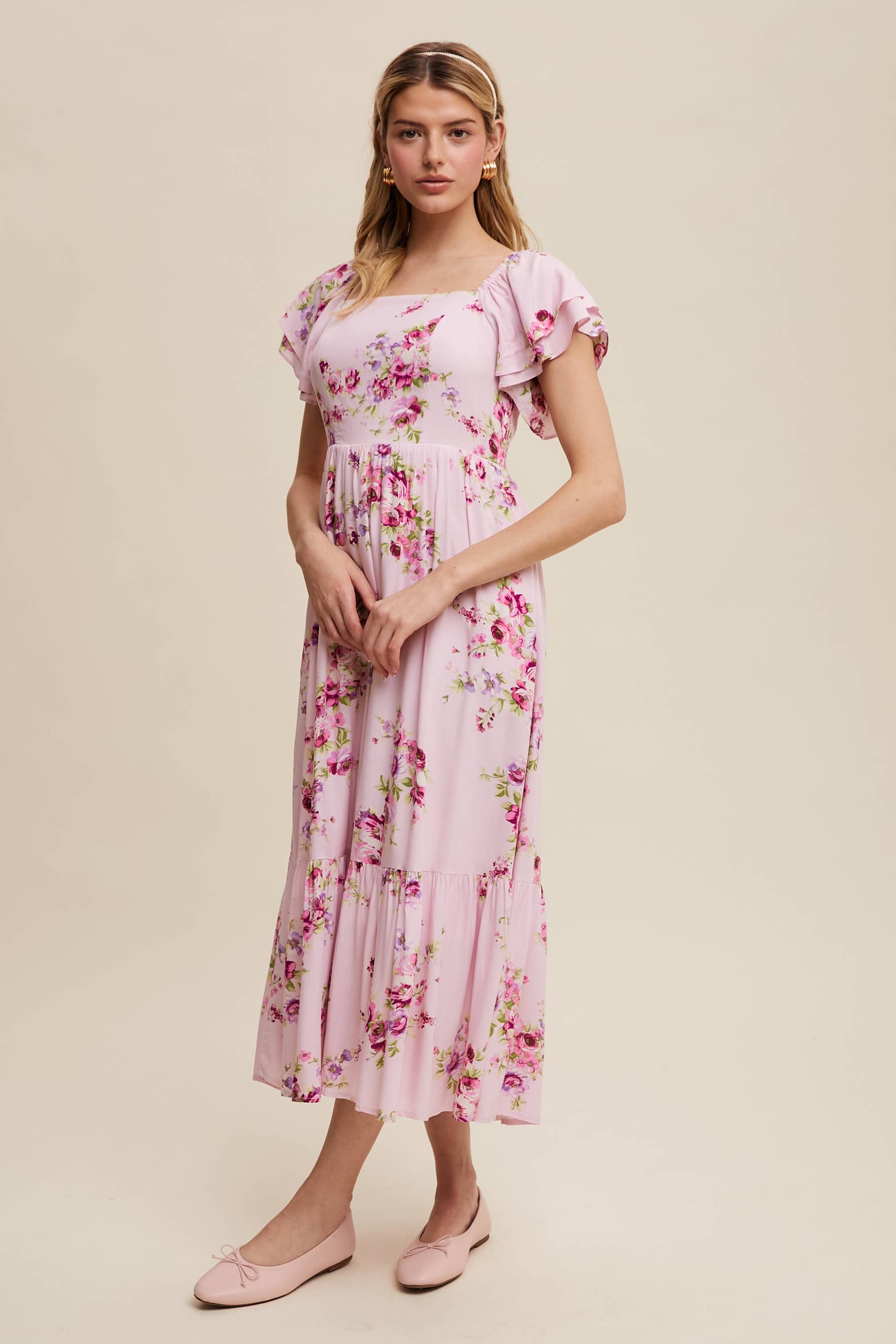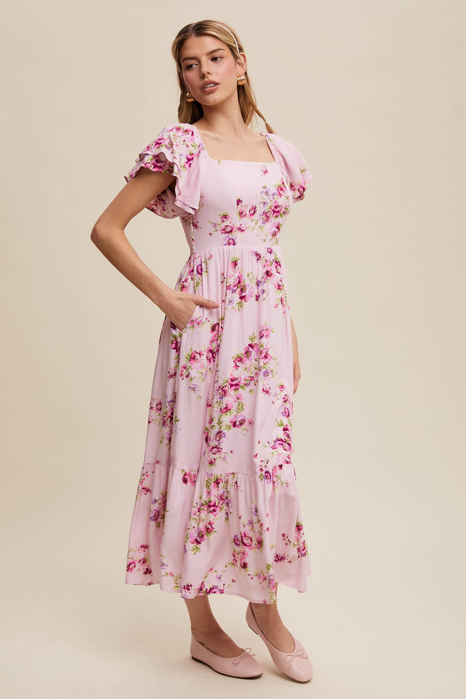 A dreamy floral maxi dress with romantic ruffle details and a breezy silhouette, perfect for warm-weather outings and special occasions. It is fully lined & has pockets.