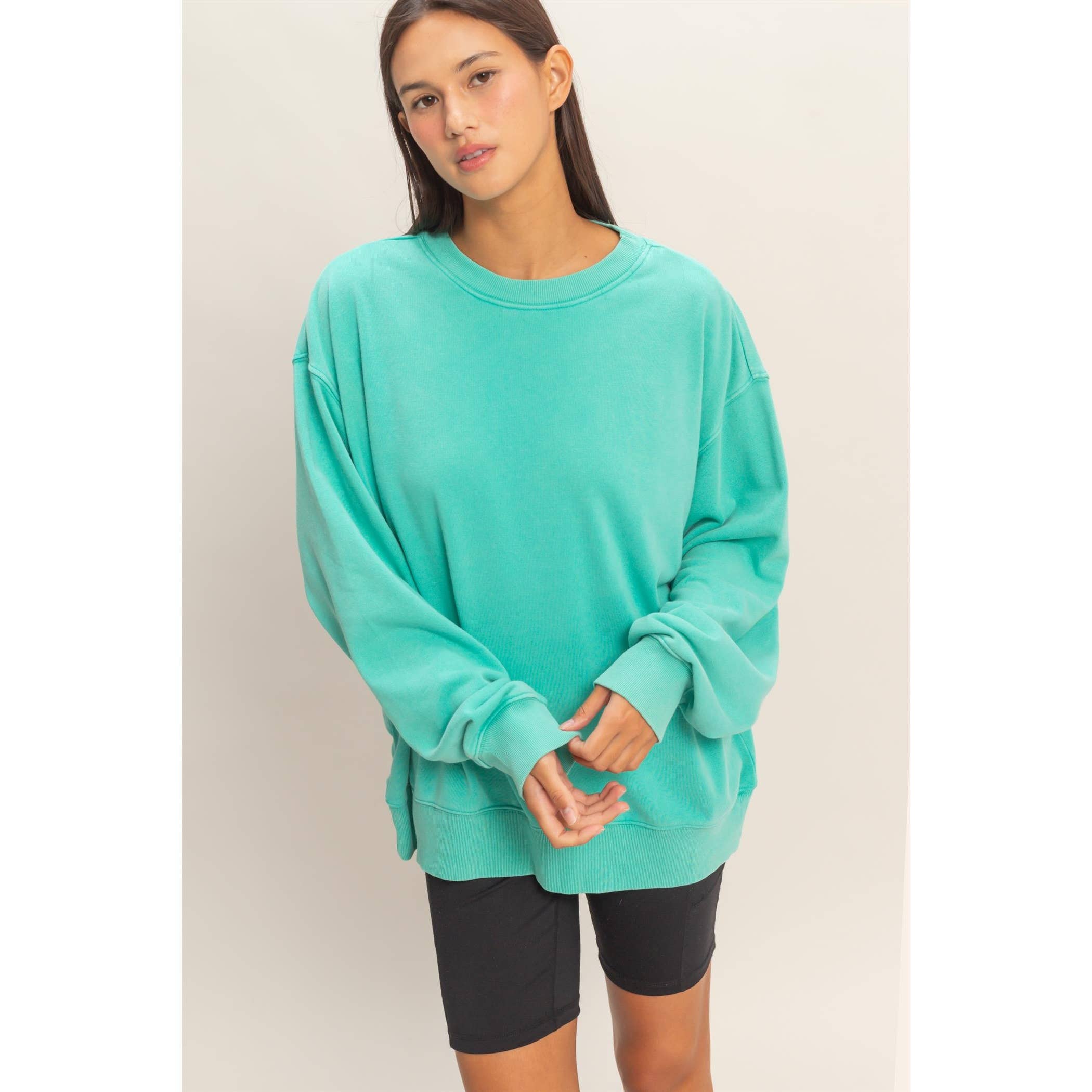 This essential sweatshirt offers ultimate comfort with soft French terry, featuring a mineral washed finish providing a faded, vintage texture. The design includes a ribbed crew neckline and dropped shoulders with full long sleeves and ribbed cuffs. With an oversized and relaxed fit, it pairs perfectly with joggers and sneakers for a laid-back look.
