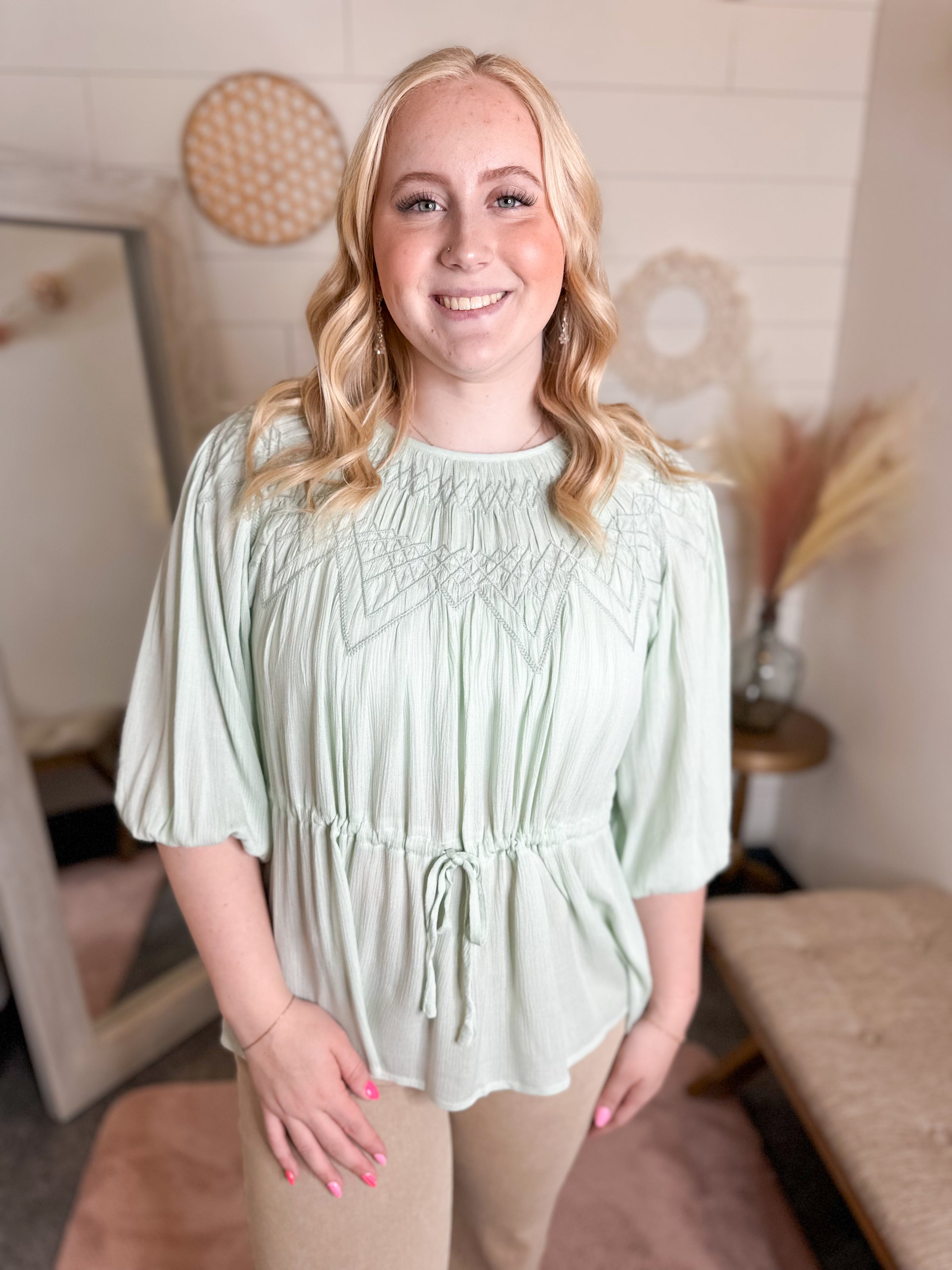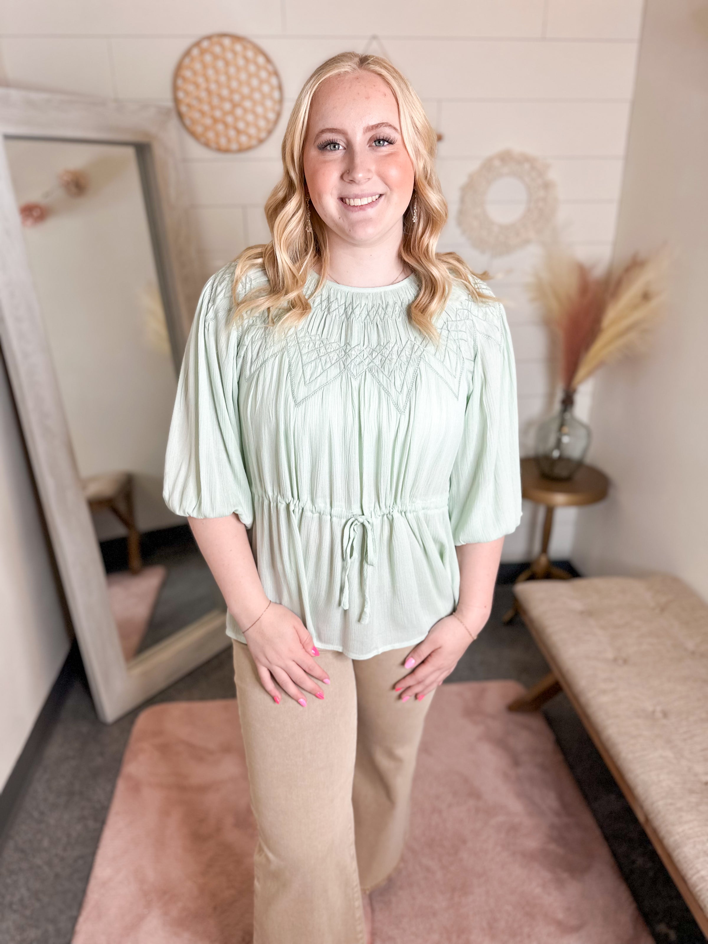 Soft, feminine, and effortlessly chic. This top features delicate smocked detailing across the neckline, flowy pleated fabric, and a flattering adjustable drawstring waist that creates the perfect shape. The airy sage color and relaxed sleeves make it an easy choice for spring days, whether you’re dressing it up with white denim or keeping it casual with your favorite jeans.