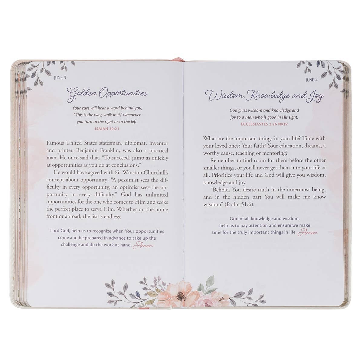 Women face complicated decisions every day. In the Godly Wisdom for Women White Faux Leather Devotional, they will find encouragement to face those difficult choices. This collection of 365 devotions guides women to delve into God's Word, communicate with Him through prayer, and confidently move forward, trusting that He will lead them down paths He has already prepared.