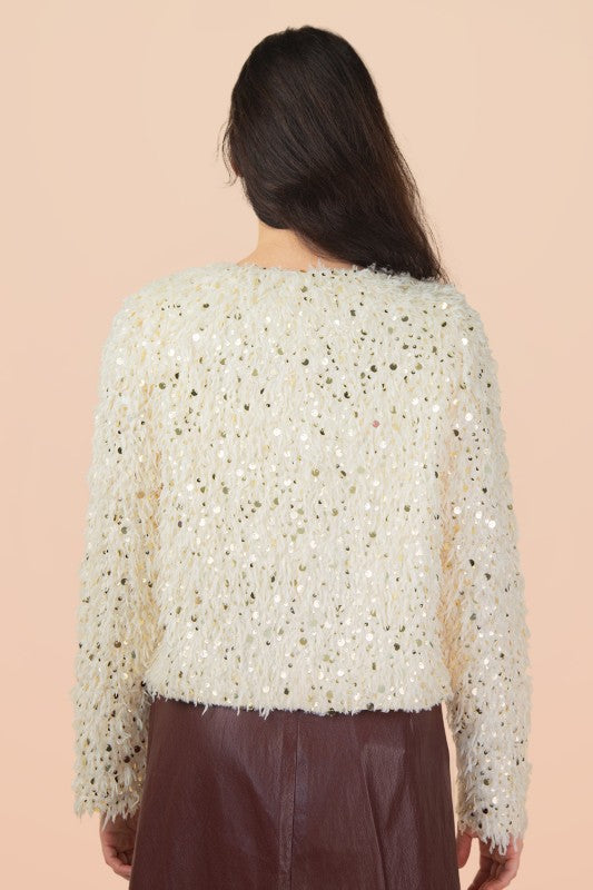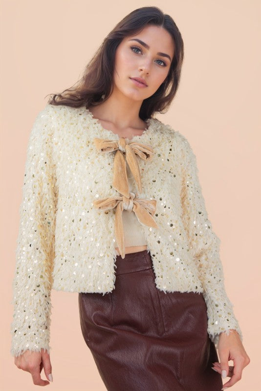 This sequin, textured holiday jacket has a beautiful tie detail. Perfect for parties!